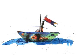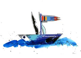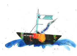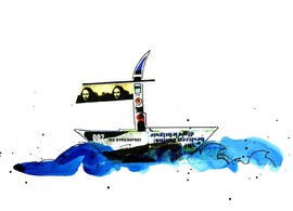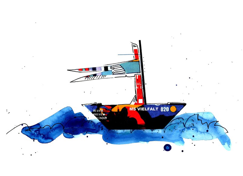Wer sich auf das Experiment einlässt und durch eines der Fenster ins Häuschen schaut, taucht ein in einen maritimen Pop-Art-Mikrokosmos, in dem der Fantasie keine Grenzen gesetzt sind. Es ist leicht, sich vorzustellen, wie die Schiffchen in dreidimensionalem Raum auf fünf Quadratmetern „Weltmeeren“ umhersegeln. Der Beobachter wird für einige Momente wieder zum Kind.