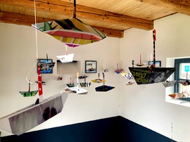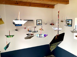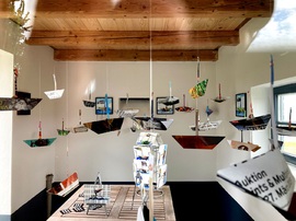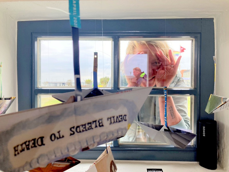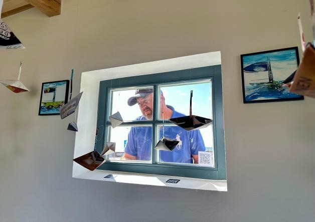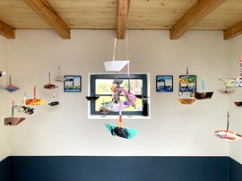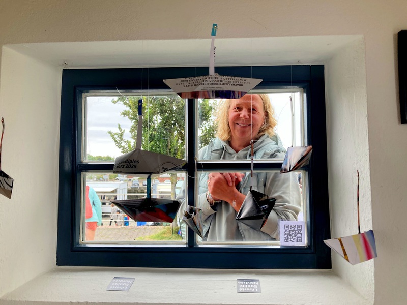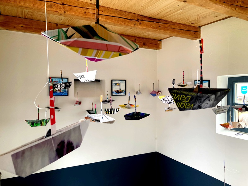 Je nach Sonnenstand und Lichteinfall ergeben sich beim Blick ins Flaggenhäuschen neue Eindrücke, egal wohin man schaut. Jedes Schiffchen ist einzigartig, gefaltet aus bunten Seiten von Kunstkatalogen und Zeitschriften. 500 kleine Unikate hat Andreas Petzold im vergangenen Jahr so erschaffen. Manche von ihnen hat er digitalisiert, auf hochwertigem Büttenpapier ausgedruckt und dann weiter mit Aquarell- und Lackfarben zu Bildern und edlen Postkarten verarbeitet. Ausgesuchte Exemplare hängen nun im Flaggenhäuschen gerahmt an der Wand, natürlich mit reichlich (Aquarell-)Wasser unterm Kiel.