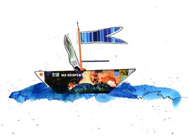 Die Arbeiten von KUNSTEINS sind natürlich keine Geisterschiffe. Sie treiben nicht führerlos über die Ozeane sondern erregen die Aufmerksamkeit über die menschlichen Augen. Die Schiffe sind gefaltete Arbeiten aus Kunstkatalogen und Kunstzeitschriften, die gescannt und anschließend auf Künstlerbütten ausgedruckt werden, bevor sie weiterer künstlerischer Transfomation mittels Tusche, Aquarell, Lackstiften und Acrylfarbe unterzogen werden. Anschließend findet eine finale Fixierung statt. Das "Geisterschiff" ist dann schließlich fertig, um auf 5m² über die Weltmeere zu treiben.Und das mit einem besonderen Namen Zumindest aus der Sicht der Kunst. Sie heißen MS Solidarität, MS Nachbarschaft, MS Menschlichkeit, MS Toleranz, MS Vielfalt, MS Respekt und MS Stressfrei oder MS Feindbild, MS Vorurteil etc.
