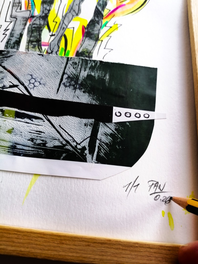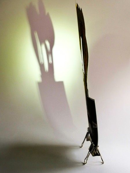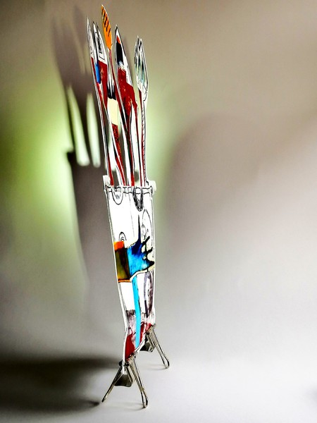 Die Auflage ist auf 5 Exemplare plus 2 e.a.* begrenzt. Die letzte kreative Intervention findet schließlich mit der Schere statt. Vase und Blumenstrauß werden freihändig ausgeschnitten und damit formal neu gestaltet. Mit dem Cutter werden abschließend Lichtreflexe als Durchblicke eingeschnitten, die bei entsprechenden Positionierung Schatten an der Wand erzeugen. Signatur und Nummerierung beenden den Gestaltungsprozess für Flower-Power. Das Original wird "einfach" als Transportsicherung gerahmt.