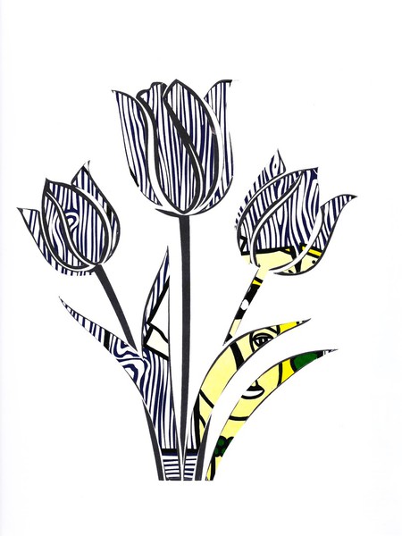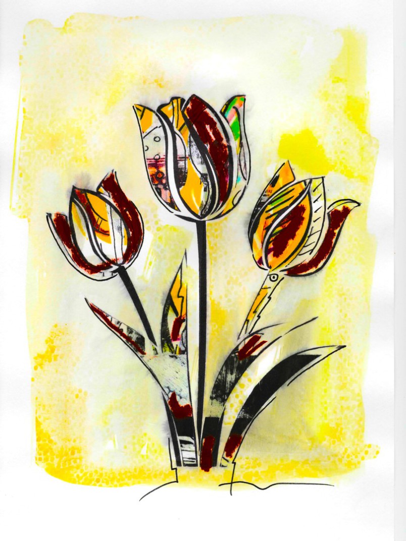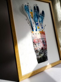 Die hier abgebildeten abstrakten Blumensträuße mit angedeuteter Vase sind kleine Kunstwerke in DIN A4. Mit Fineliner, Zeichenstift und Aquarellpinsel vorgezeichnet und mit floralen Bild- und Textmotiven aus ausgerissenen Zeitschriften als Materialcollage zu einem Original verarbeitet. Nach der Trocknungsphase findet eine erneute grafische und malerische Überabeitung statt, bevor final das Objekt der optischen Begierde gescannt und vorder- sowie rückseitig auf Boesner-Künstler-Zeichenpapier ausgedruckt wird.