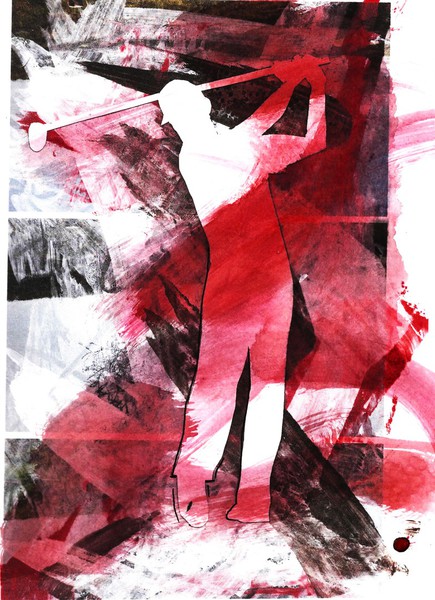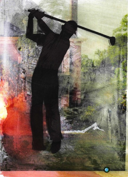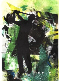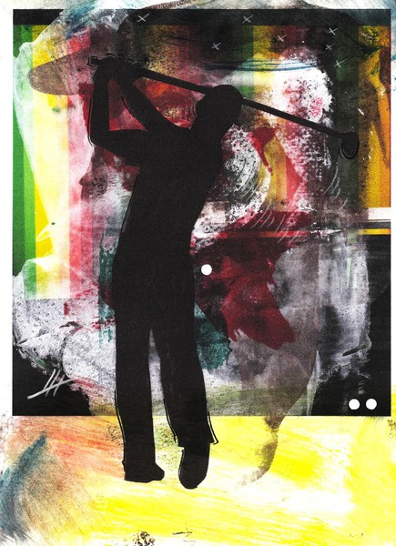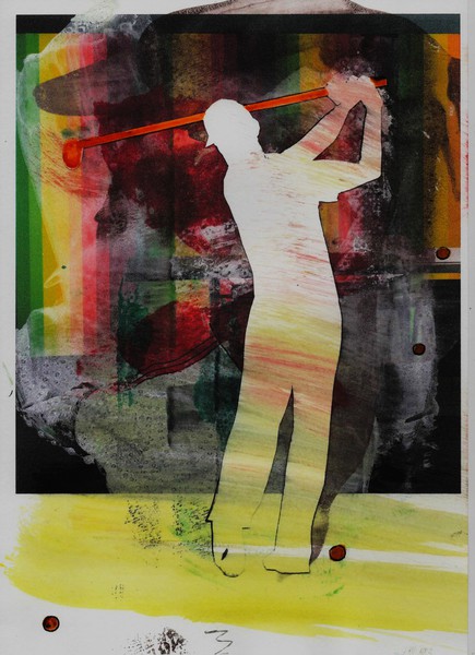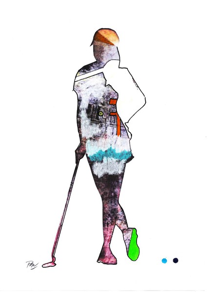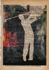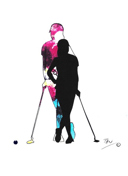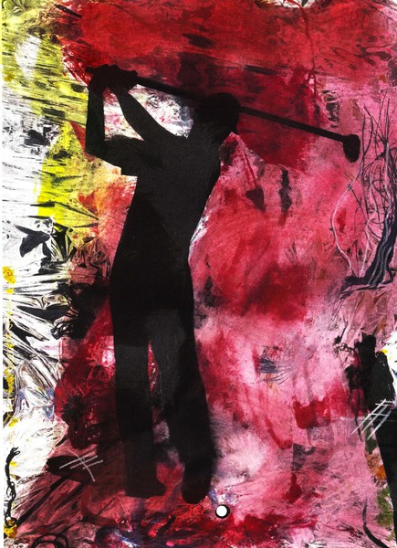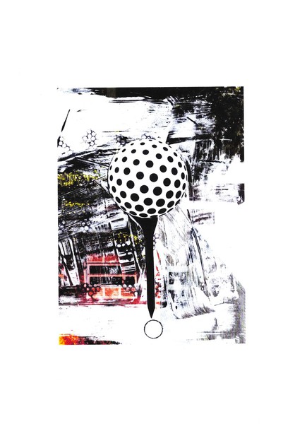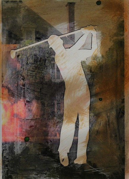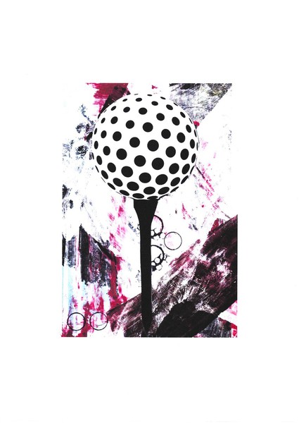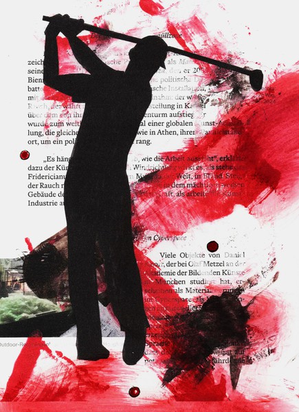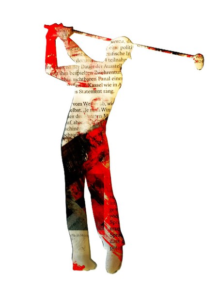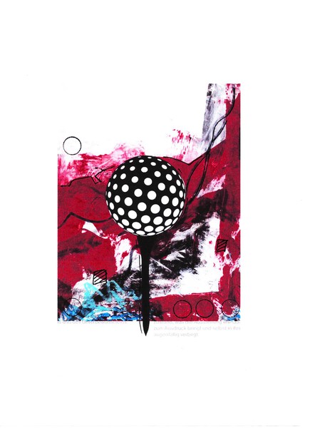 Einer der schönsten Golfplätze Deutschlands liegt vor meiner Haustür auf Föhr und ich kenne nur die Clubgastronomie, wenn ich als Gast den Blick über die Greens schweifen lassen kann. Schön ist es hier. Meine Kontakte zum Golf liegen aber eher beim Cross Golf Platz in Oevenum, da meine Schwungtechnik und mein Körper keinesfalls harmonieren. Und fliegende Grasnarben weniger sinnvoll erscheinen als eine saubere Flugbahn eines Golfballes. Hier und da habe ich immer wieder Szene-Fotos gemacht. Einige davon sind zu Skizzen zeichnerisch umgesetzt und als Vorlage zur weitergehenden Arbeit mittels positiver und negativer Silhouetten umfunktioniert worden. Als ergänzendes Arbeitsmittel sind zwischenzeitlich bewußt Golfbälle und Golf-Tees in kreativen Umsetzung als Werkzeug hinzugekommen.