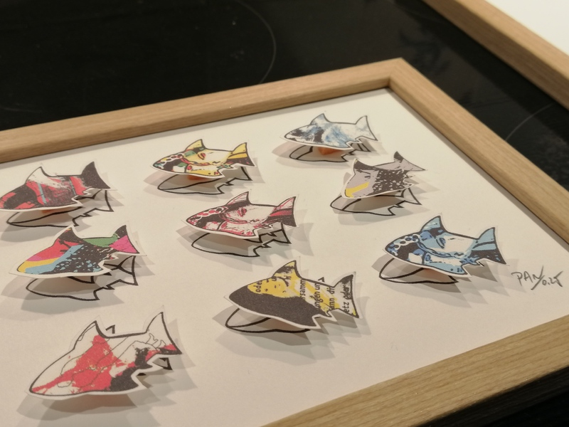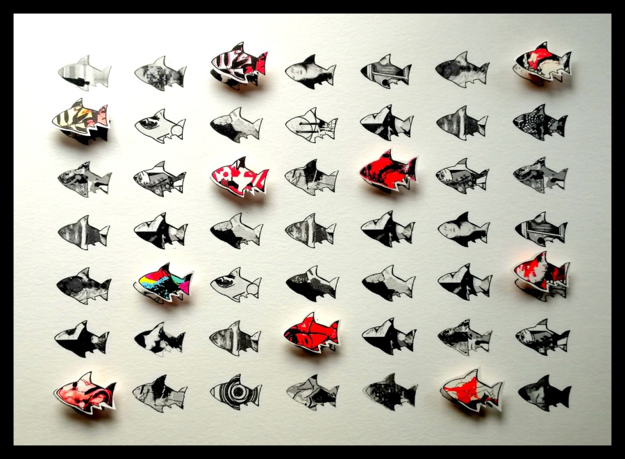 Etwa alle 6 Wochen bekommen diejenigen, die an dem Projekt KUNST-ABO teilnehmen, einen weiteren kleinen Fisch (ca. 4x3cm), rückseitig gestempelt (Föhrstück), signiert und mit einem Minischaumstoffstück (3x3mm) ergänzt, zugeschickt. Jetzt beginnt für den Empfänger/Rezipient allerdings die Entscheidungsfindung und die künstlerische Intervention. Der Fisch muss auf ein Pendant geklebt werden, um der Idee 3D-gerecht zu werden. Hier greift jetzt der Empfänger und Besitzer des Kunstwerkes selbst in den Gestaltungs- und Fertigungsprozess ein, auf den ich abschließend keinen Einfluss mehr habe und die Arbeit weitergehend ihre eigene Aura entfaltet.