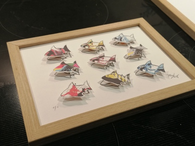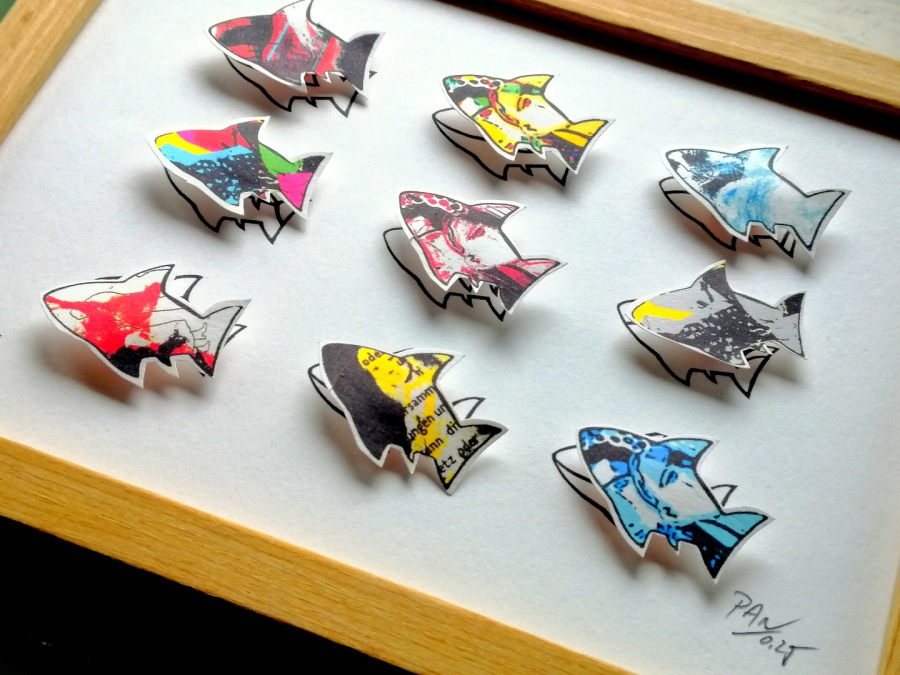 Hier sind die vier Fischmotive FISCH EINS bis FISCH VIER abgebildet. Die Auflage ist auf 15 Exemplare plus 2 Exemplare e.a. festgelegt, forderseitig mit 1/1 gezeichnet, signiert und datiert. Auf der Rückseite befindet sich der Namen des Abonnenten und der Stempel nebst erneuter Signatur. Die Arbeit kostet 150,00 € einschließlich aller zu liefernder Abo-Fische im angegebenen Zeitfenster. Die Arbeit wird mit einem losen Fisch, einem Minischaumstoffstück (3x3mm) und Holzrahmen ohne Glas ausgeliefert. Wo der erste Fisch fixiert wird obliegt allein dem Eigner/Abonnenten. Um den kommunikativen Faktor zu stärken, sollten alle Teilschritte der Abonnenten fotografisch dokumentiert werden, um den unterschiedlichen Gestaltungs- und Wahrnehmungsprozess besser nachvollziehen zu können. Ich werde die Partizipation hier auf der Projekthomepage begleiten und zum gegenseitigen Kommunizieren - auch über die sozialen Medien - auffordern.