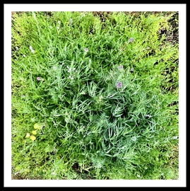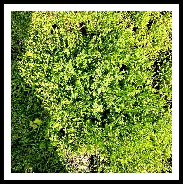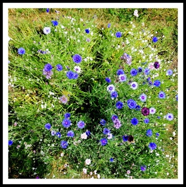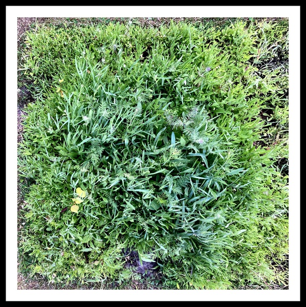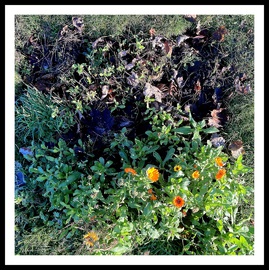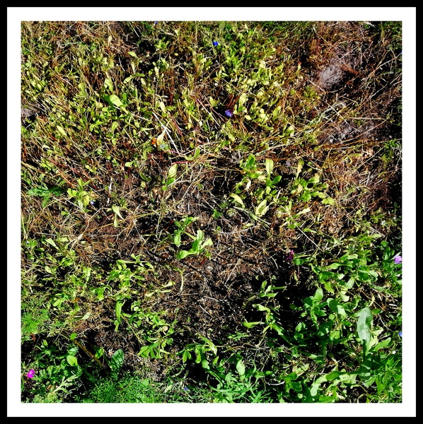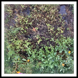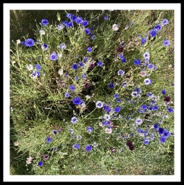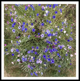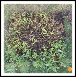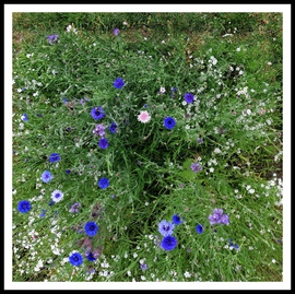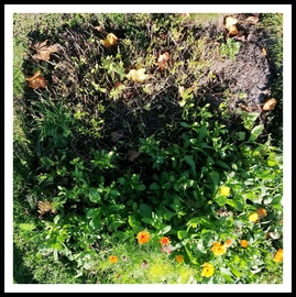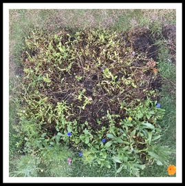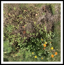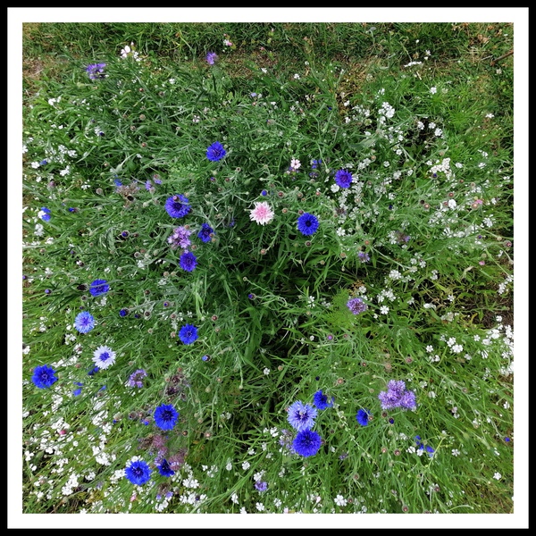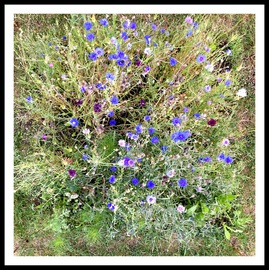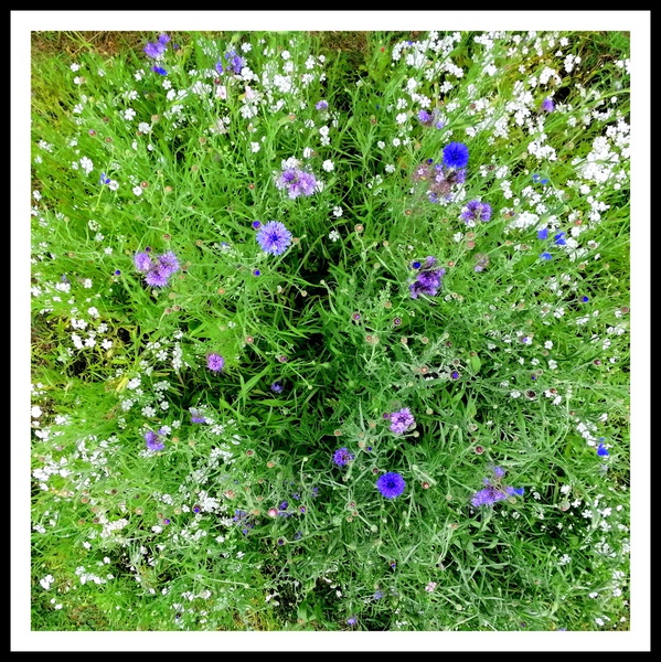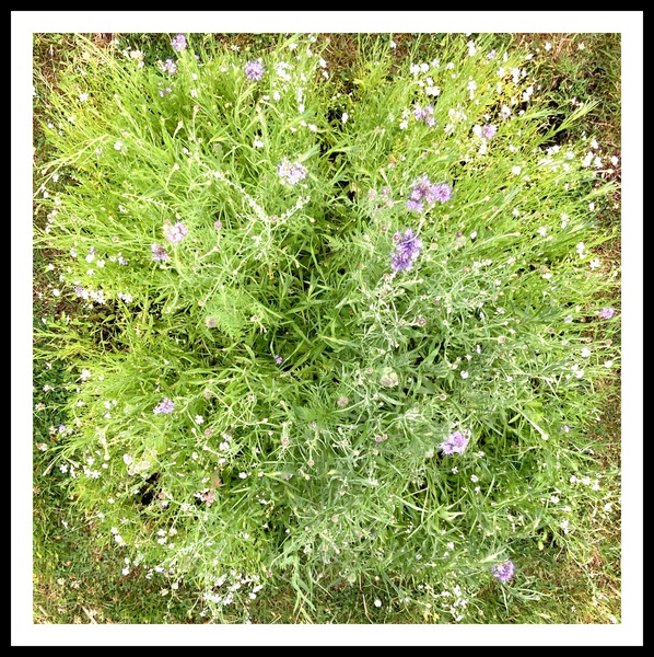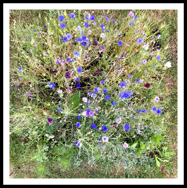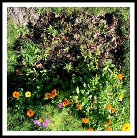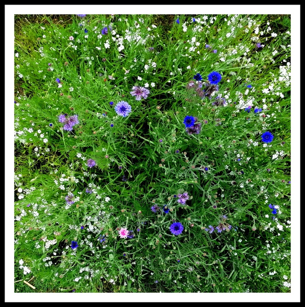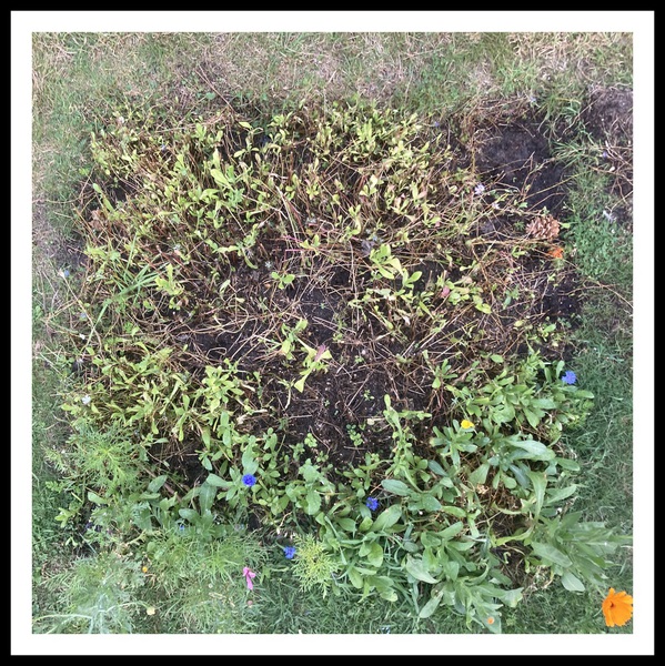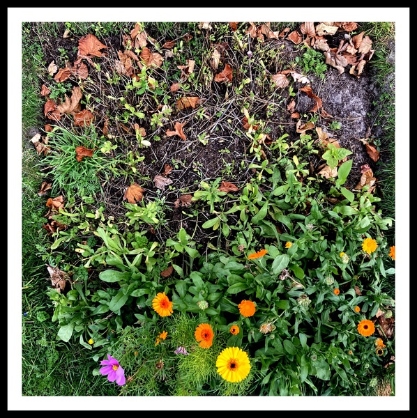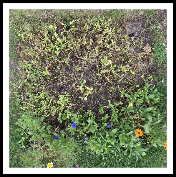Und hier entstand im wahrsten Sinne des Wortes von Ernst W.Gombrich ein Brutkasten/ein Quadrat mit insektenfreundlichen Pflanzen. Im Laufe der Zeit hat sich dieses quadratische Bild vielfarbig entwickelt und von oben betrachtet vielleicht an niederländische Blumen-Stillleben erinnert. Ein Angebot zum Staunen, Lachen, Erfreuen und natürlich auch zum Ärgern.