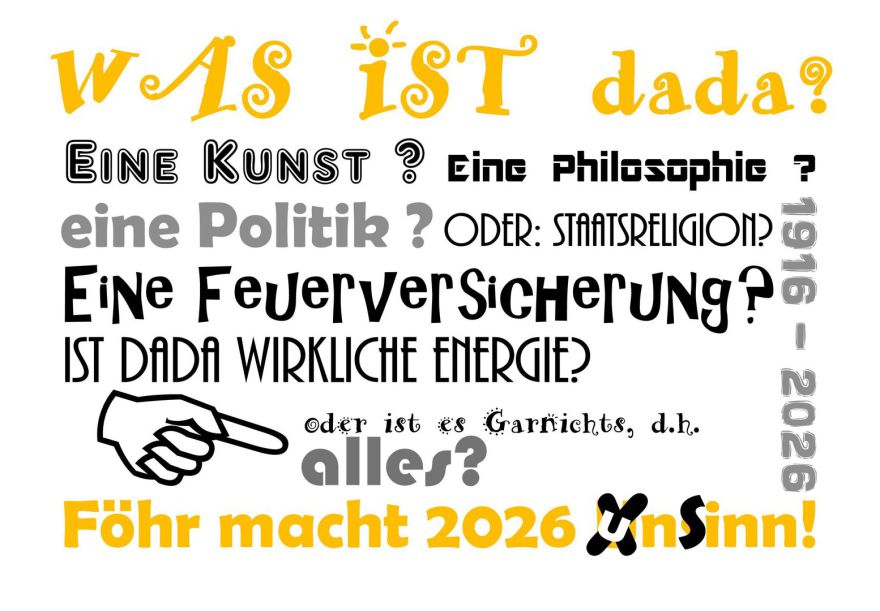 Eine perfekte Form, 2026 den unSinn auf der nordfriesischen Föhr, als DADA-Satellit wie früher es früher Hannover mit Schwitters war, durch „unsinnige“ Veranstaltungen, wie Ausstellungsdokumentationen und künstlerische Experimente zu kultivieren, um letztendlich doch Sinn zu stiften. Oder? Planbar ist das Ganze dennoch nicht. Denn DADA gab es vor DADA, während DADA und ist auch lange nach DADA noch aktuell. Wer DADA möglichst authentisch darstellen will, muss ihn/es vorher allerdings in Frage stellen oder verraten.